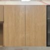 - Shelves: White 3/4″ cabinet grade plywood with metal shelf pins. Base cabinets come with half-deep shelves.